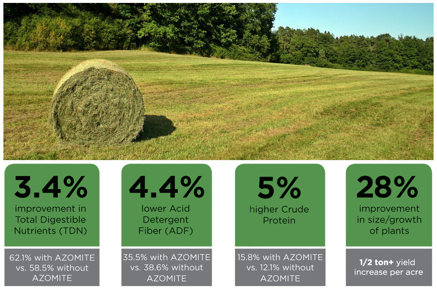 In recent side-by-side field tests, granulated AZOMITE® was blended with fertilizer by local leading fertilizer blenders and applied to hay fields in Utah and Virginia. The following results showed more than a half ton yield increase — 3.5 tons per acre with AZOMITE® versus 2.8 tons per acre without AZOMITE®. Click image or download study for full results. »